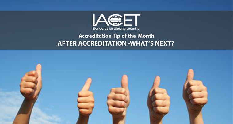 This is not the end however, but merely the beginning of your relationship with IACET. For the application to have been successful, you had to provide important documentation to show compliance. This continues on an annual basis as long as you are an accredited provider. You will need to submit documents and answer questions to maintain your status as an Accredited Provider.
