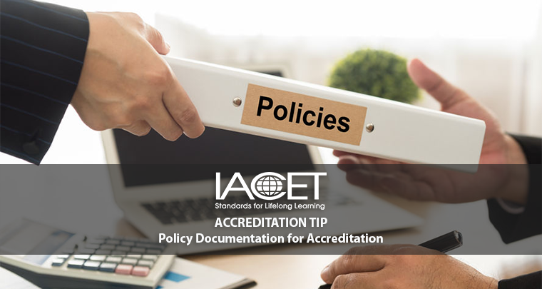 In the ANSI/IACET 1-2018 Standard, categories and elements 1.6A, 1.7A, 1.8A, 3.1A, 6.2A, 8.6A require policies. The majority of these elements also require supporting evidence documents that demonstrate how the policies are transmitted to those responsible for implementation and adherence. The reviewers will also want to see documentation that shows that the learners are informed of the organization’s policies that affect their experience with the learning event.